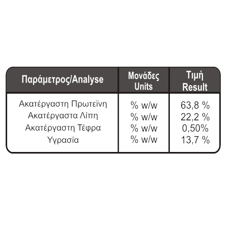 Ακατέργαστη πρωτεΐνη 63,8%, ακατέργαστα λίπη 22,2%, ακατέργαστη τέφρα 0,50%, υγρασία 13,7%.